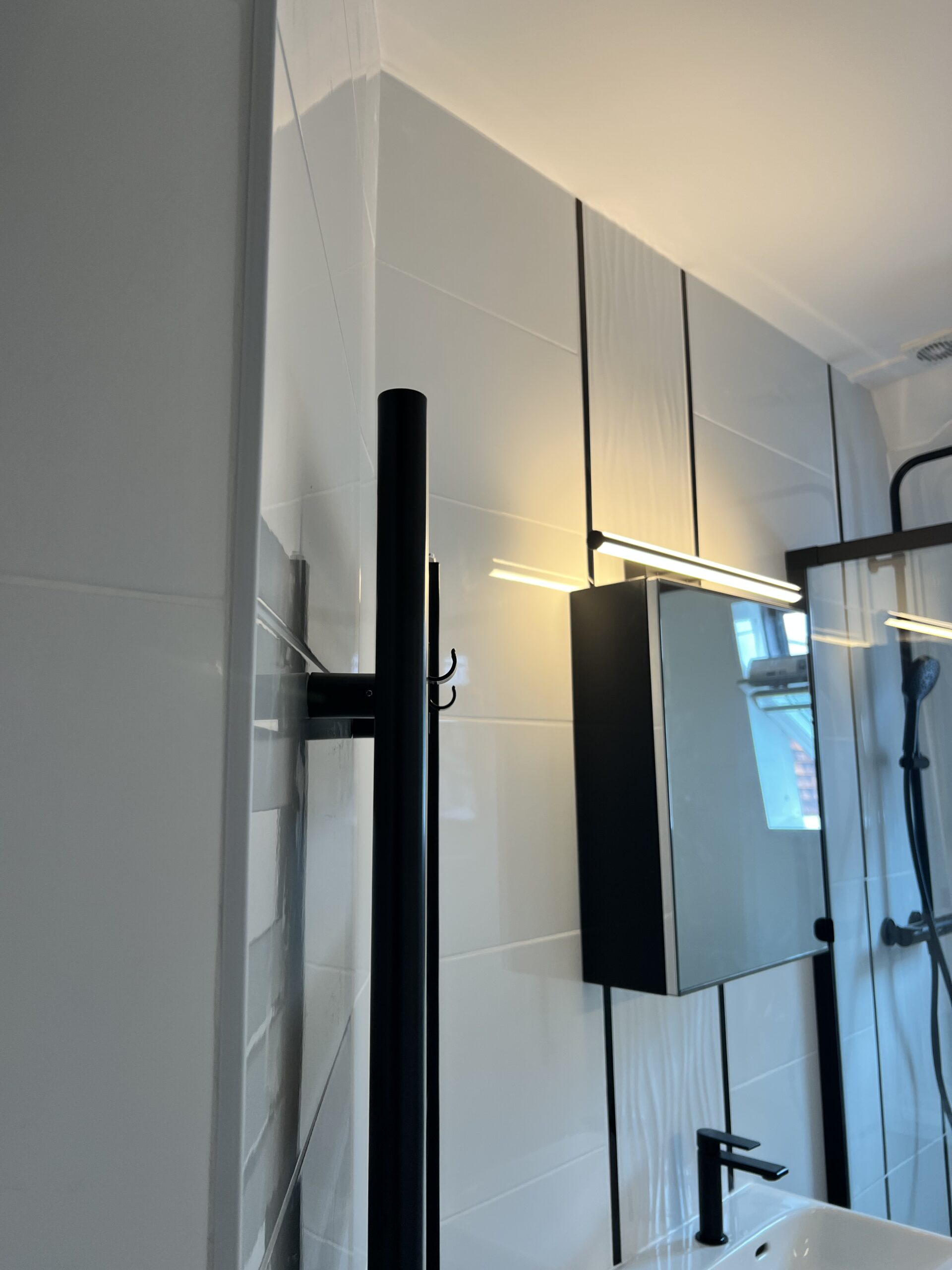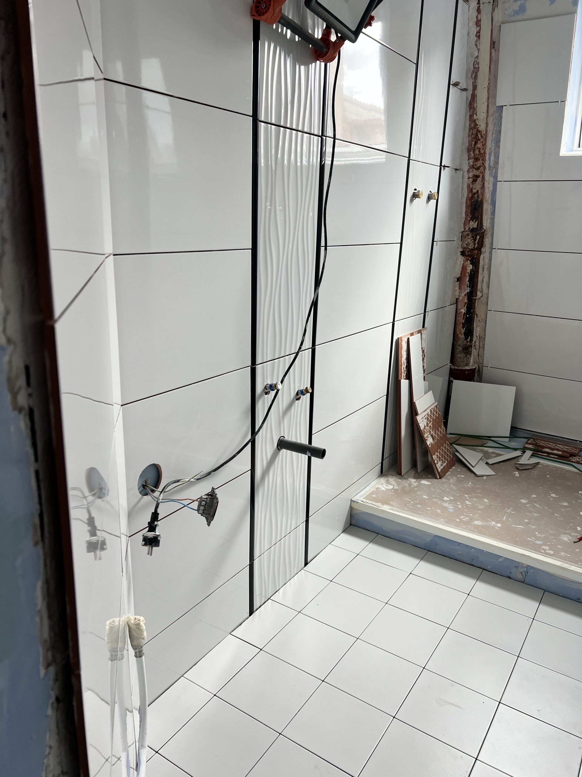 Assainissement des murs, enduit, peinture, carrelage, électricité, luminaires, ameublement et accessoires.